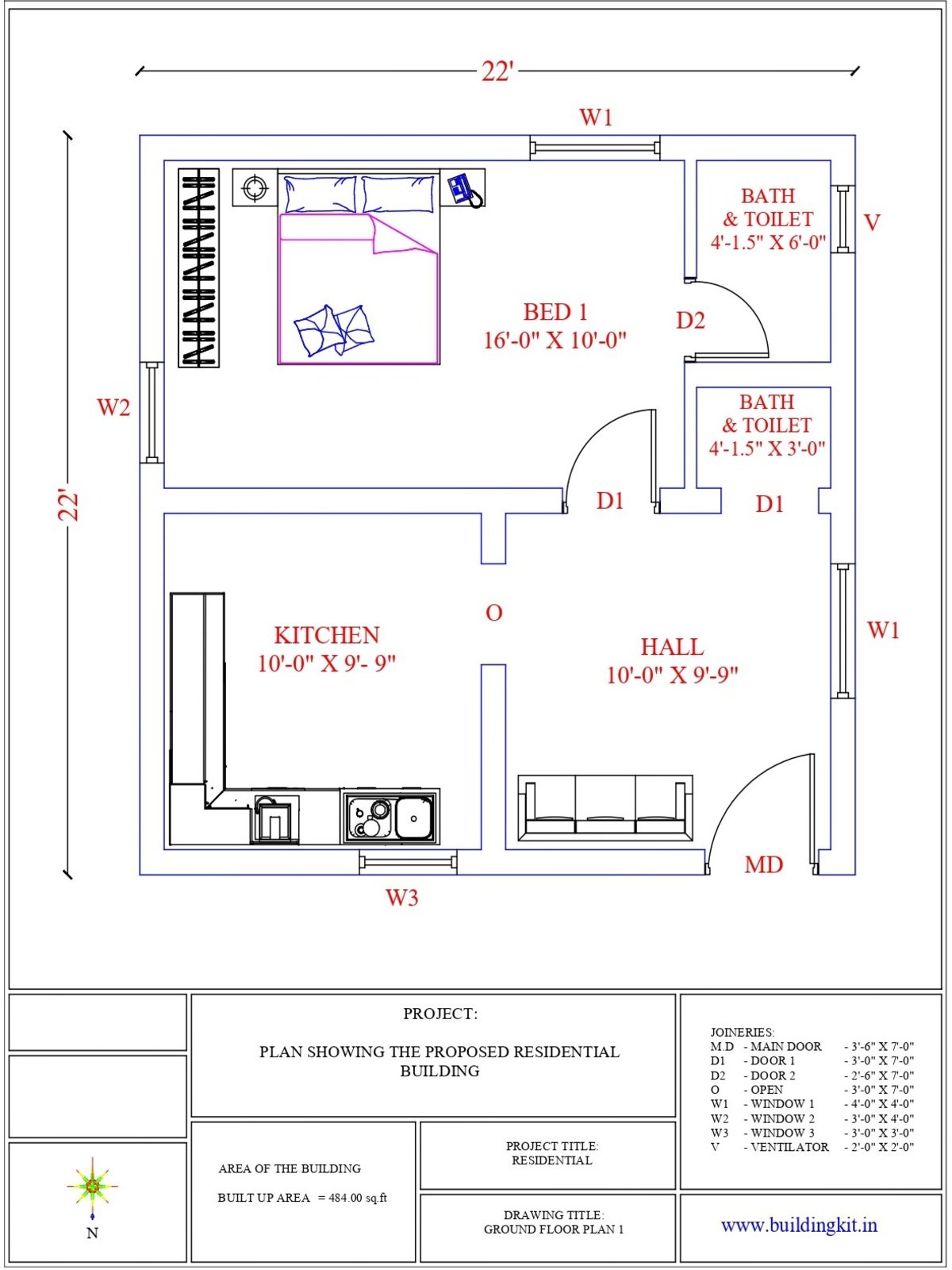22’0″ x 22’0″ 1BHK